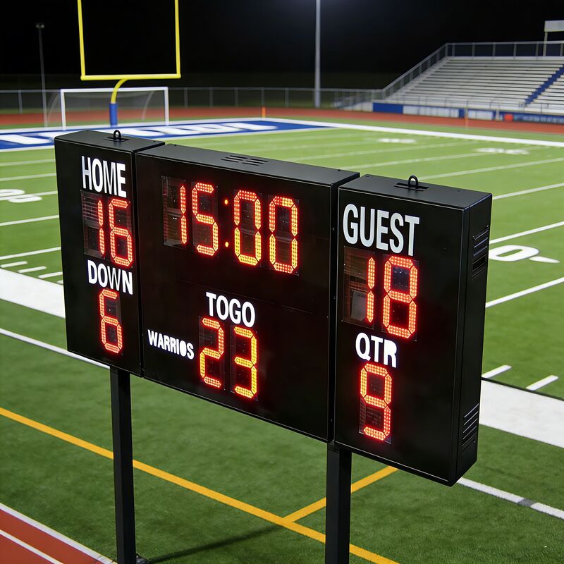 Ubicado justo al lado del campo, permite la sincronización manual o remota instantánea de la puntuación, ayudando al personal clave a seguir el progreso del partido de un vistazo.